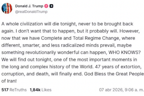 El mandatario realizó estas declaraciones a través de Truth Social, donde afirmó que una nueva dirección política en Irán podría abrir la puerta a un escenario distinto, aunque también advirtió sobre el riesgo de consecuencias graves si la situación escala, al señalar que incluso “toda una civilización podría desaparecer esta noche”.