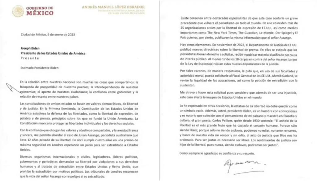 En la carta dirigida a Donald Trump en 2020, el presidente mexicano apeló al “humanismo y cordialidad” en su relación para pedirle compasión y un indulto para Assange, cuya salud se había deteriorado severamente en prisión. “Me permito apelar a su humanismo a la cordialidad y al respeto que ha caracterizado la relación entre nosotros y a su actitud de amistad para con México y nuestro gobierno para hacerle una petición especial en torno a la situación del señor Julian Assange”, señaló López Obrador en la carta.