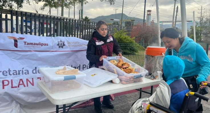 20-enero-2025 Ciudad Victoria, Tamaulipas. En respuesta a las bajas temperaturas registradas en la región, la Guardia Estatal de Género, en el marco del Plan Tamaulipas, llevó a cabo una jornada humanitaria en el Hospital Infantil y la Central de Autobuses de Ciudad Victoria. Como parte de esta iniciativa, el personal entregó pan y café caliente