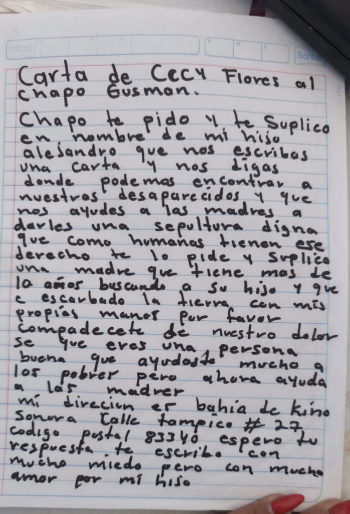 La Ceci Flores, líder del Colectivo de Madres Buscadoras de Sonora, envió una carta a Joaquín “El Chapo” Guzmán para solicitar información sobre personas desaparecidas presuntamente por el Cártel de Sinaloa, en un intento por obtener pistas que permitan a las familias localizar a sus seres queridos.
