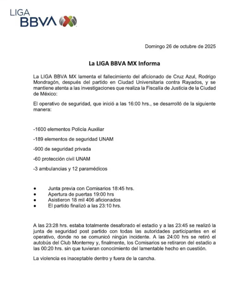 El operativo de seguridad del partido entre Cruz Azul y Monterrey inició a las 16:00 horas del sábado y contó con un despliegue de 1,600 elementos de la Policía Auxiliar, 189 del personal de seguridad de la UNAM, 900 de seguridad privada y 60 de protección civil universitaria, además de tres ambulancias y doce paramédicos. La junta previa con los comisarios se realizó a las 18:45, y las puertas del estadio se abrieron a las 19:00, con una asistencia oficial de 18,406 aficionados. De acuerdo con la Liga MX, el partido finalizó a las 23:10 y el estadio quedó totalmente desalojado a las 23:28. Posteriormente, la junta de seguridad post partido no reportó “ningún incidente” y los comisarios se retiraron sin conocimiento de la tragedia. La liga lamentó la muerte de aficionado y condenó la violencia, subrayando que se mantiene atenta a la investigación de la Fiscalía General de Justicia de la Ciudad de México (FGJ-CDMX).