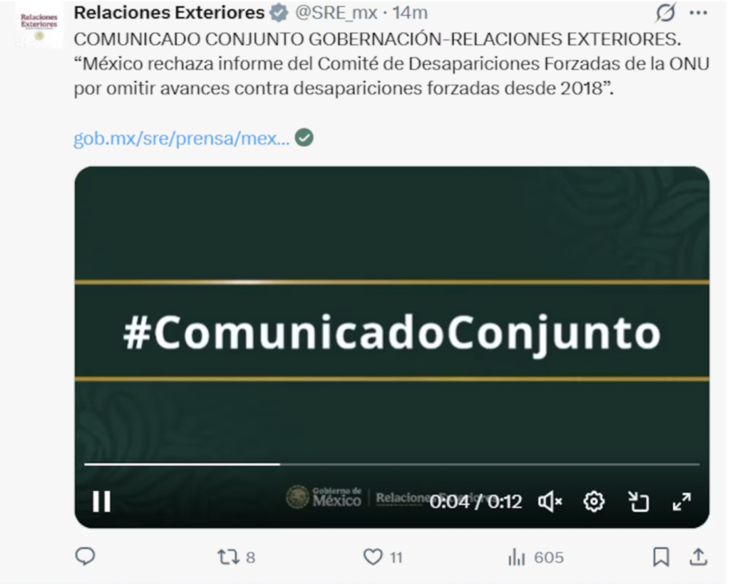 La Secretaría de Relaciones Exteriores reiteró que el Gobierno mexicano no tolera desapariciones forzadas. También aseguró que no las permite ni las ordena. Señaló que se han impulsado reformas legislativas e institucionales con colectivos de familiares.