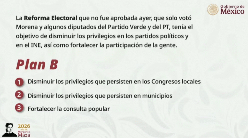 La presidenta Claudia Sheinbaum anunció su Plan B electoral después de que su propuesta de Reforma Electoral fuera rechazada en la Cámara de Diputados. La iniciativa únicamente recibió el respaldo de legisladores de Morena, algunos del Partido Verde y un diputado del Partido del Trabajo, mientras PRI, PAN, Movimiento Ciudadano y otros grupos parlamentarios votaron en contra, lo que impidió su aprobación.