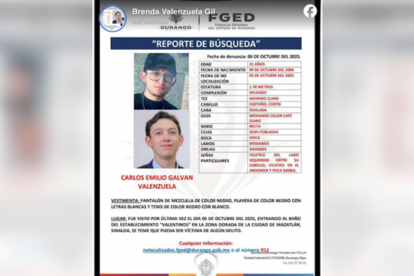 La Fiscalía de Durango emitió la ficha de búsqueda con descripción de Carlos Emilio: mide 1,83 metros, complexión delgada, cabello café, ojos café claro, tez blanca, vestía pantalón de mezclilla negro, playera negra con letras blancas y tenis blancos con detalles negros. La autoridad solicita a la ciudadanía aportar cualquier información que ayude a localizarlo.