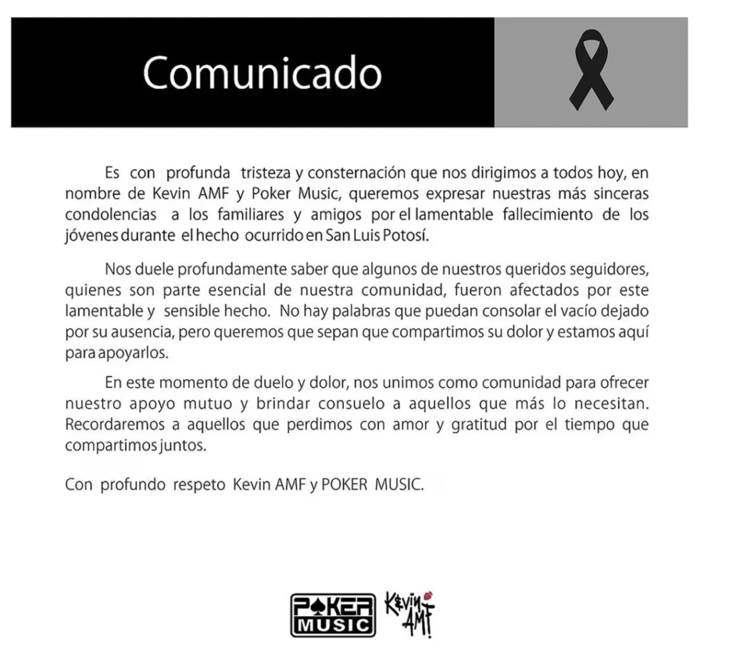 En el mensaje compartido por Kevin Moreno, conocido artísticamente como Kevin AMF, se puede leer la profunda tristeza y consternación ante los hechos acontecidos. “Es con profunda tristeza y consternación que nos dirigimos a todos hoy, en nombre de Kevin AMF y Poker Music, queremos expresar nuestras más sinceras condolencias a los familiares y amigos por el lamentable fallecimiento de los jóvenes durante el hecho ocurrido en San Luis Potosí”, indica el comunicado.