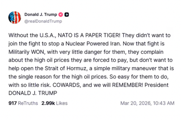 A través de su red Truth Social, Donald Trump aseguró que, sin Estados Unidos, la OTAN es “un tigre de papel” y reprochó que no se hayan unido a la lucha para frenar a un Irán con armas nucleares.