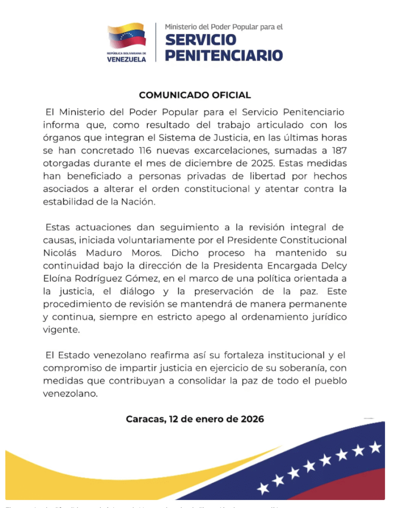 Según el comunicado oficial del Ministerio para el Servicio Penitenciario, 116 presos políticos fueron liberados en recientes días como parte de criterios de revisión permanente de detenciones, agregando a otras excarcelaciones realizadas en diciembre de 2025.